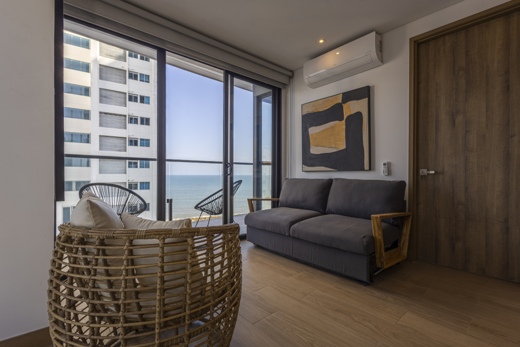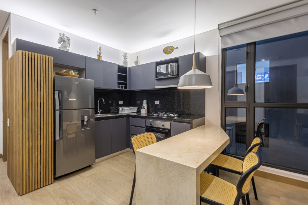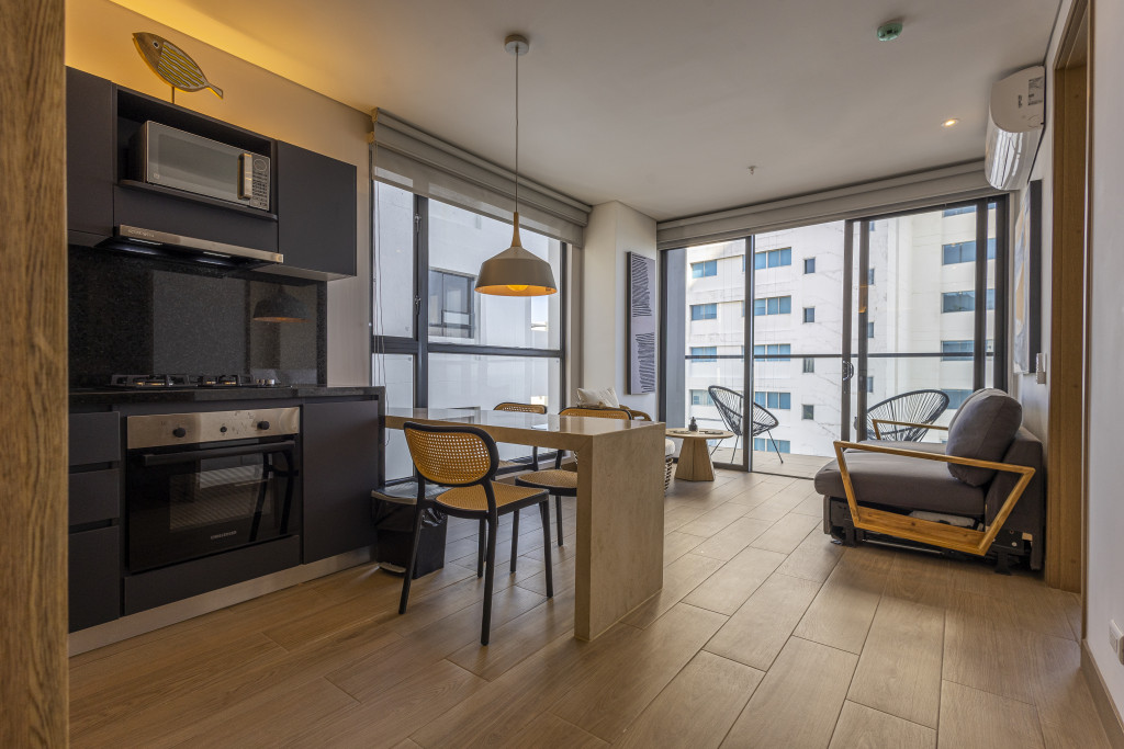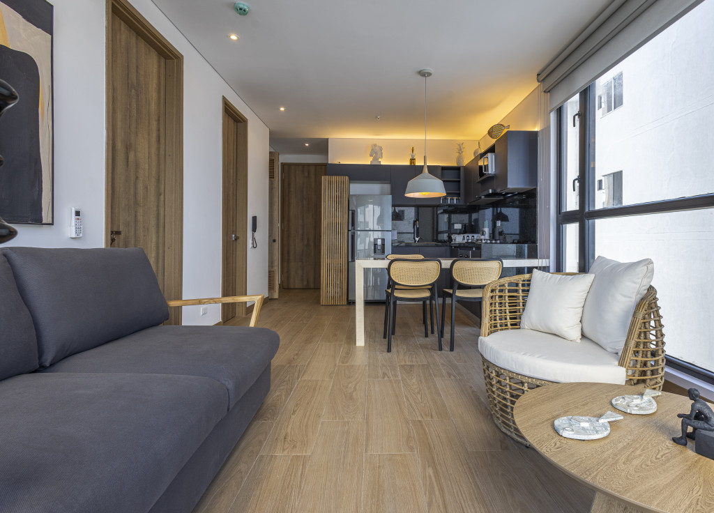 Vive el lujo y la comodidad en este exclusivo apartamento de 64.20 m², con 2 habitaciones y 2 baños, ubicado en una zona residencial de alta demanda y diseñado para quienes buscan estilo, confort y una excelente inversión; el inmueble cuenta con aire acondicionado, balcón con vista exterior, cocina integral y sala-comedor completamente amoblados, además de acceso a amenidades premium como piscina tipo infinity con vista panorámica a la ciudad y al mar, gimnasio, vigilancia privada 24/7 y planta eléctrica, todo con un diseño moderno y acabados de alta calidad que hacen de este apartamento el lugar ideal para vivir o invertir.