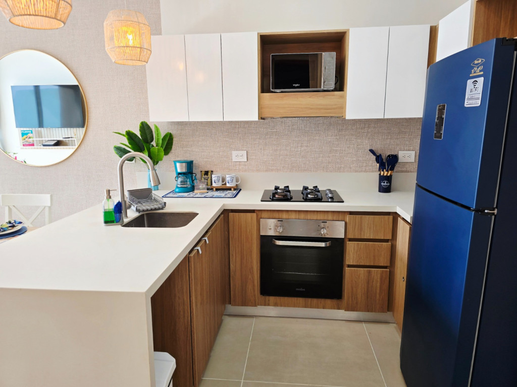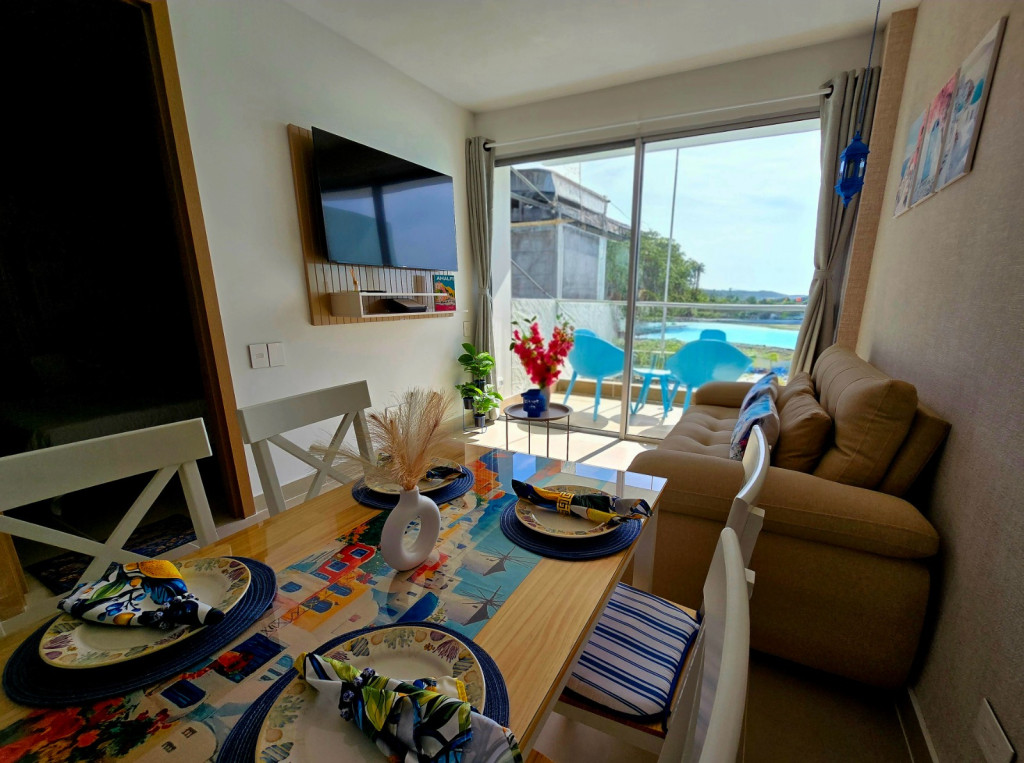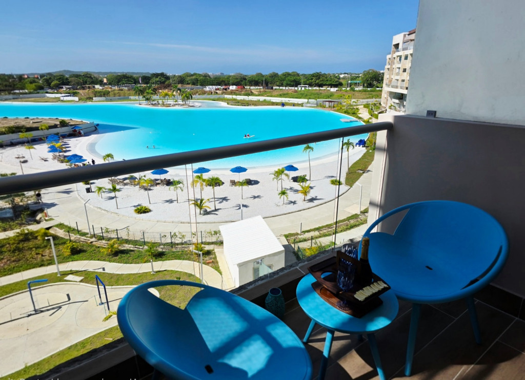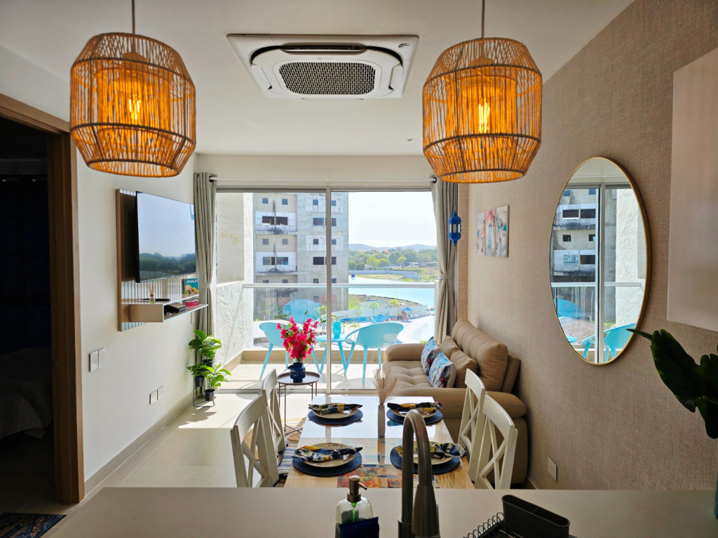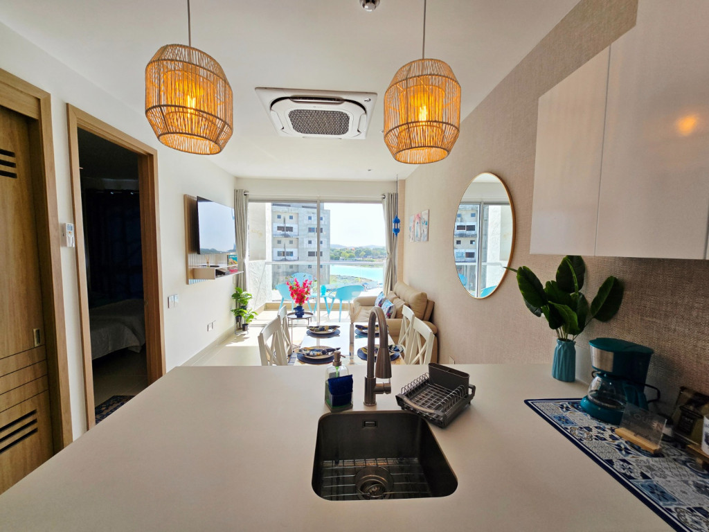 Apartamento amoblado para la venta, estilo resort, ubicado en la zona norte de la ciudad de Cartagena; sector exclusivo y de alta demanda hotelera; ideal para inversionistas, lo puedes promocionar por Airbnb, booking y demás portales de renta turística (actualmente cuenta con reservas existentes); en edificio de 5 pisos, consta de la playa artificial mas innovadora y novedosa del pais, salón social, coworking, kids club, tennis and squash club, jacuzzis, senderos del lago, gimnasio, spa, cine bajo estrellas, minigolf, zona BBQ, vigilancia privada, sistema de circuito cerrado de TV, ascensores, gabinete de incendios, sensor de movimiento, lobby; el apto consta de amplio balcon, 1 habitacion, 1 baño, sala – comedor, cocina integral moderna con barra americana, zona de labores, aire acondicionado, mobiliario moderno; a pocos metros del aeropuerto internacional Rafael Nuñez, minimercados, droguerías, restaurantes de comidas típicas y tradicionales en las Ramblas, cómodas vías de acceso.