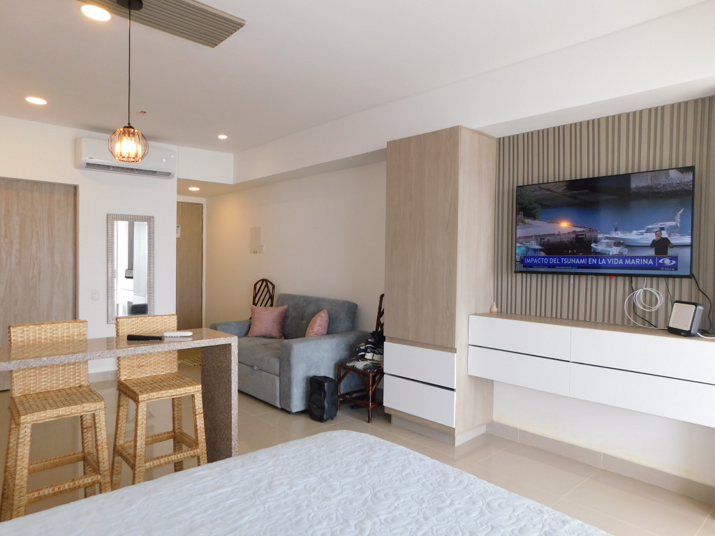 Apartamento amoblado en arriendo – Venta, ubicado en el barrio Crespo de Cartagena; encuentra tranquilidad y un agradable ambiente en sector exclusivo de la ciudad, ideal para arriendo turístico, AIRBNB, Booking, entre otros portales (con reservas existentes); en edificio de 16 pisos, cuenta con 4 ascensores modernos, parqueadero comunal, multiples piscinas para adultos y niños, gimnasio, salón social para eventos, baño turco, vigilancia privada las 24/7, sistema cerrado de TV; el apto consta de balcón con vista al Mar, aire acondicionado, monoambiente, 1 baño, cocina integral abierta; a pocos metros del parque lineal, senderos peatonales, zonas verdes, parques, canchas deportivas, a pocos pasos del aeropuerto internacional Rafael Nuñez, almacenes de cadena, restaurantes tradicionales, panaderías, tiendas cabecera de barrio, iglesia, transporte publico cercano, cómodas vías de acceso, a tan solo 5 minutos del centro historico de la ciudad; la oportunidad ideal que estabas esperando.