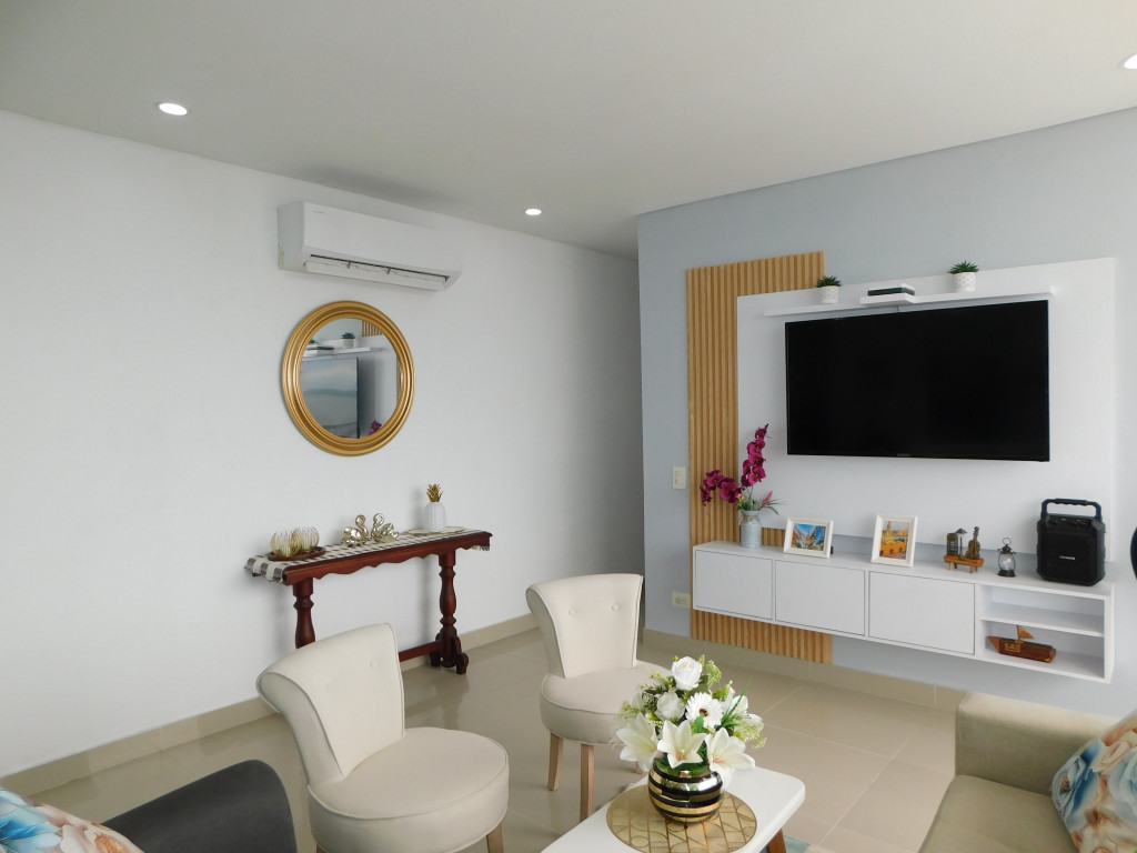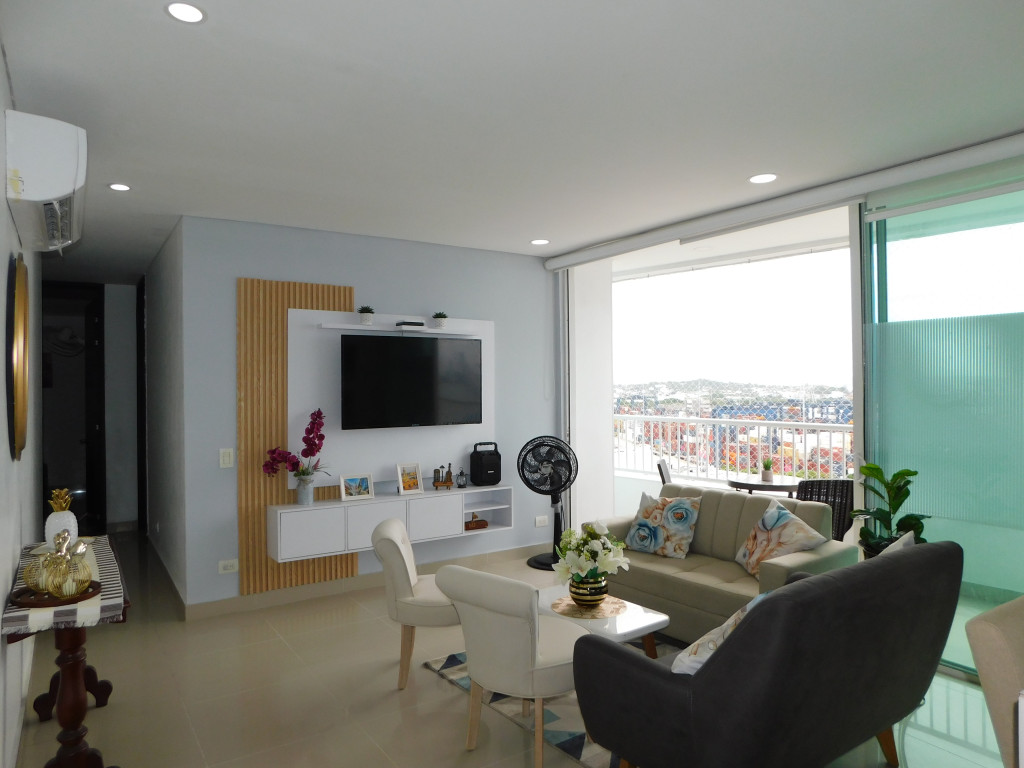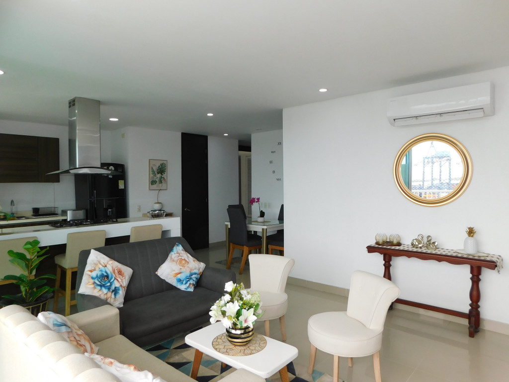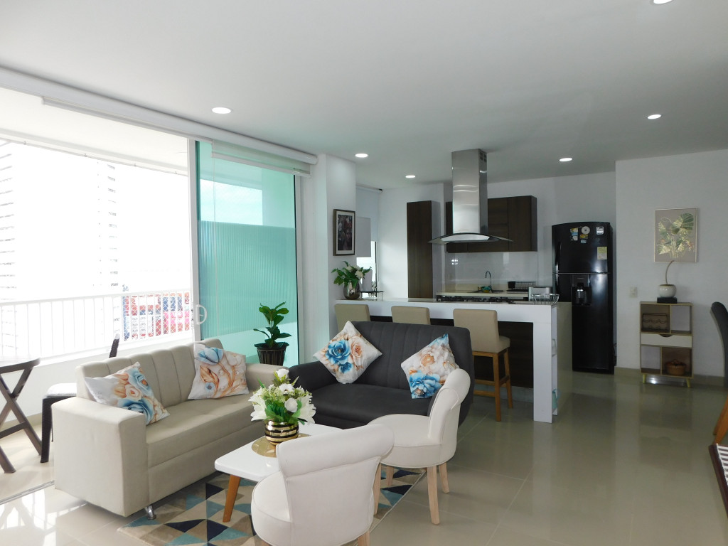 Apartamento amoblado para arriendo, ubicado en el barrio Manga de Cartagena; ambiente familiar, bríndale la oportunidad a tus seres queridos de vivir en un espacio agradable, único, especial para el bienestar de ellos; el edifico cuenta con 23 pisos, multiples piscinas, gimnasio, zona de juegos infantiles, cancha deportiva, zona BBQ, salónes sociales para eventos, lobby, parqueadero cubierto, vigilancia las 24/7, circuito cerrado de TV ; el apto consta de amplio balcón con vista externa hacia la Bahia de Cartagena, sala – comedor, aire acondicionado, 3 habitaciones, 2 baños, estudio, cocina integral abierta, baño social, zona de labores, alcoba y baño de servicio, parqueadero cubierto; cerca a importantes centros comerciales, salas de cine, heladería, instituciones educativas, restaurantes tradicionales, almacenes de cadena, boutiques, instituciones financieras y bancarias, instituciones prestadoras de servicios de salud, transporte publico cercano, a pocos pasos del centro histórico.