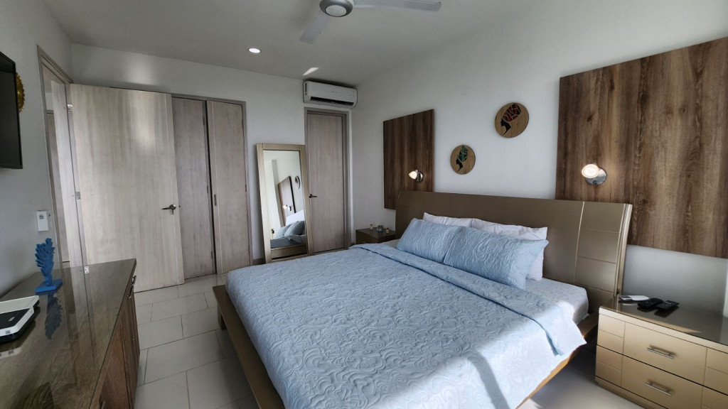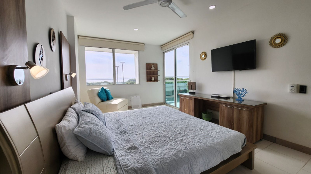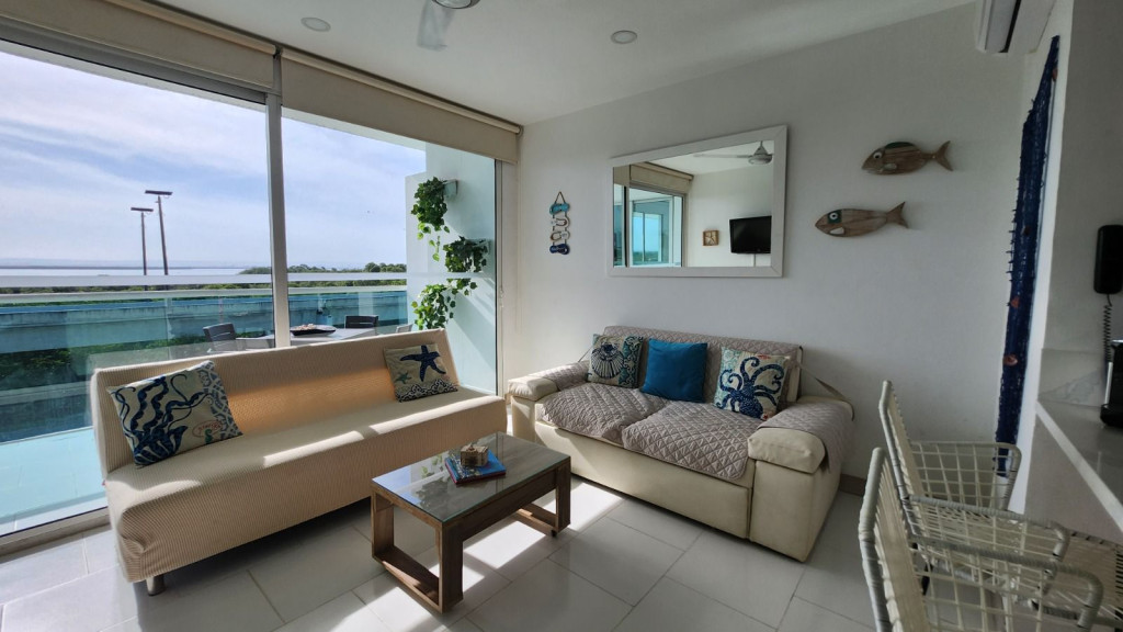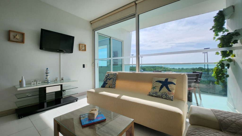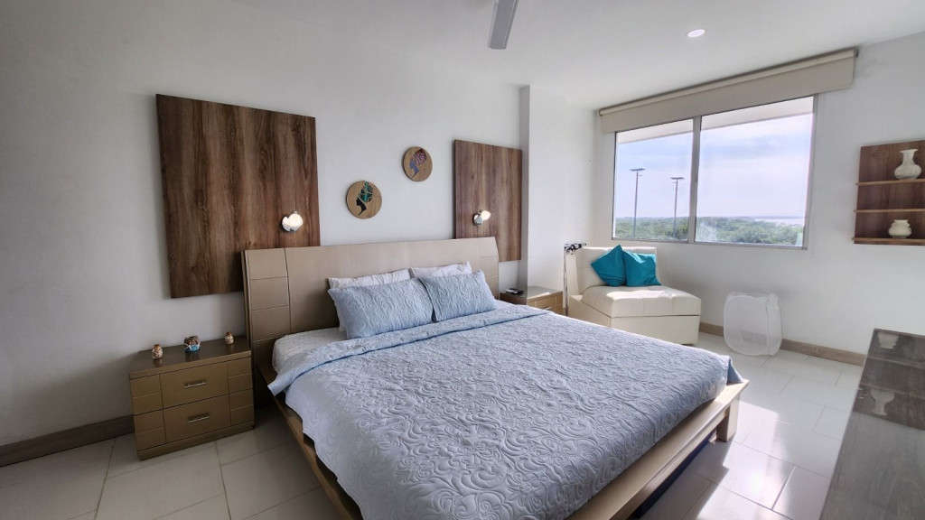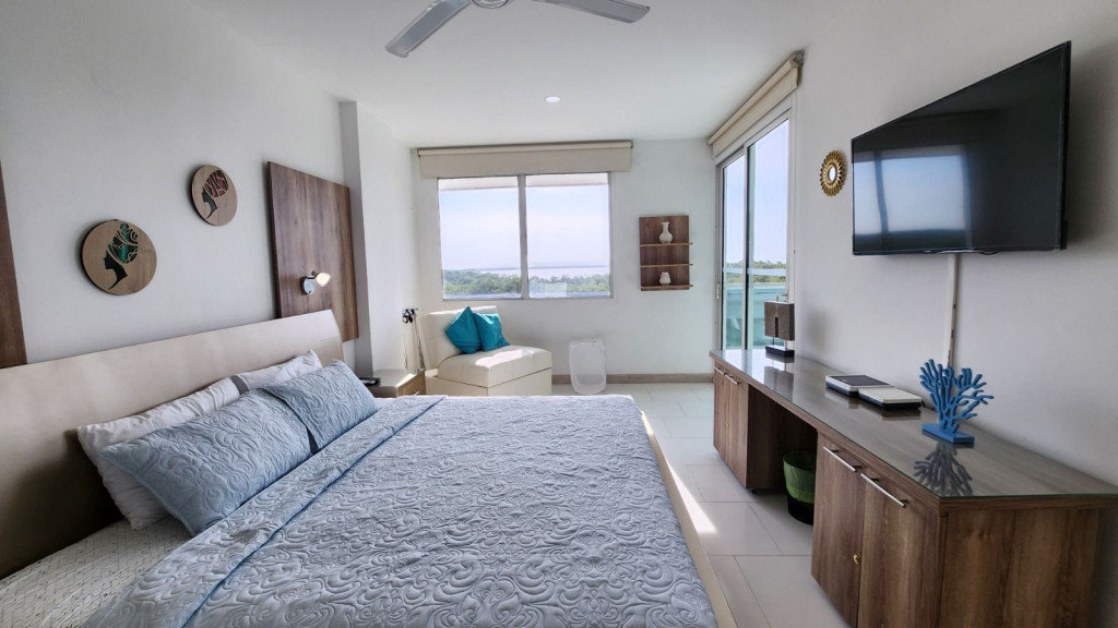 Apartamento para la venta, estilo resort, ubicado en la zona norte de la ciudad de Cartagena; sector exclusivo y de alta demanda hotelera; ideal para inversionistas, lo puedes promocionar por Airbnb, booking y demás portales de renta turística (actualmente cuenta con reservas existentes); en edificio de 7 pisos con salida directa hacia el mar, consta de multiples piscinas para adultos y niños, gimnasio moderno – dotado, salón social para eventos, zona de juegos infantiles, sistema cerrado de TV, vigilancia privada las 24/7, parqueadero cubierto, multiples ascensores, gabinete de incendios, sensor de movimiento, lobby, planta electrica; el apto consta de amplio balcon con vista hacia a la laguna, 1 habitacion, 2 baños, closets, sala – comedor, cocina integral abierta, zona de labores; a pocos metros del aeropuerto internacional Rafael Nuñez, minimercados, droguerías, restaurantes de comidas típicas y tradicionales; a pocos minutos del centro historico y turistico; cómodas vías de acceso