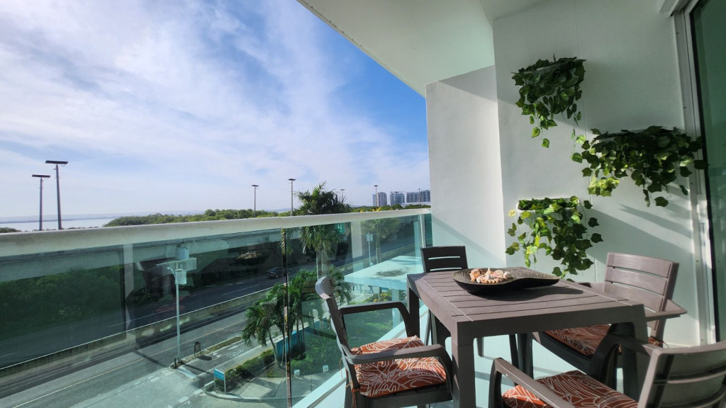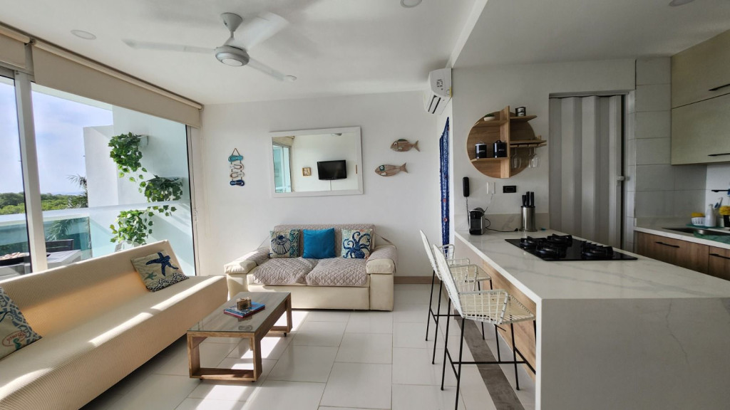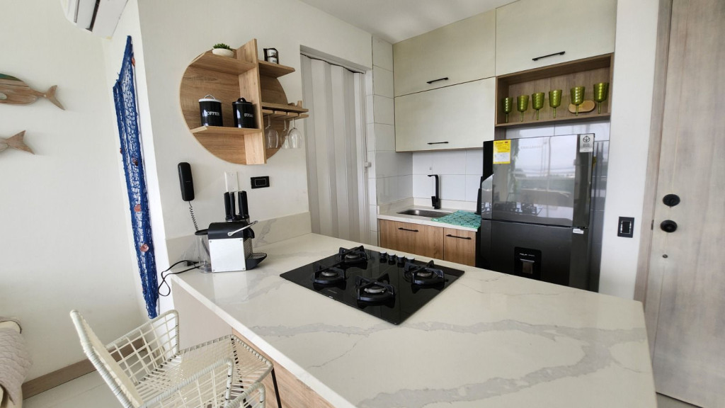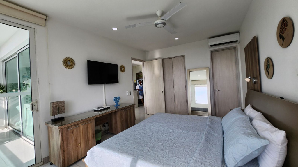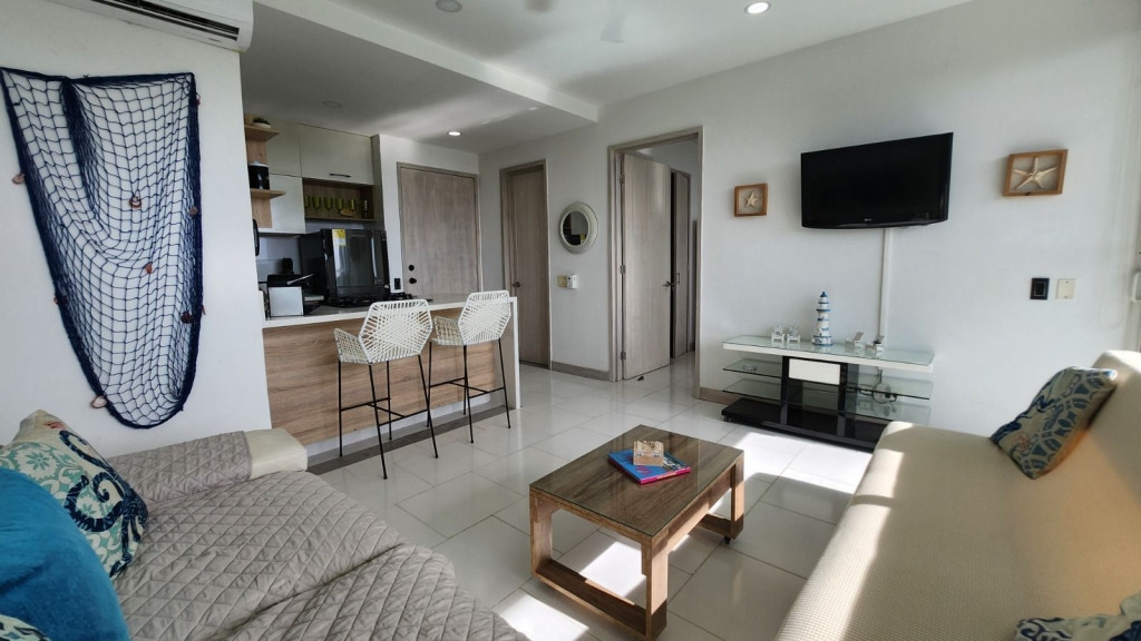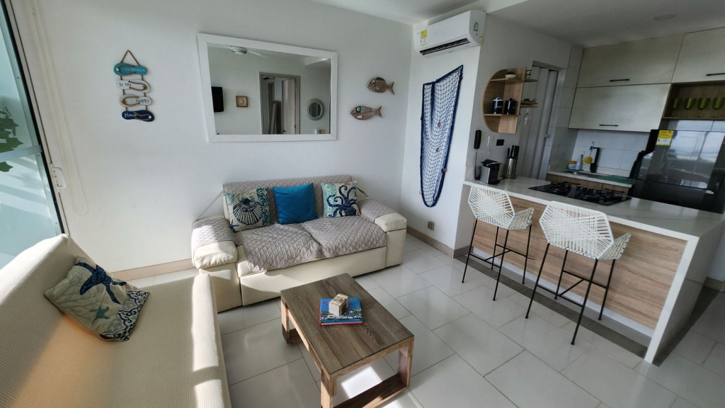 Apartamento para la venta, estilo resort, ubicado en la zona norte de la ciudad de Cartagena; sector exclusivo y de alta demanda hotelera; ideal para inversionistas, lo puedes promocionar por Airbnb, booking y demás portales de renta turística (actualmente cuenta con reservas existentes); en edificio de 7 pisos con salida directa hacia el mar, consta de multiples piscinas para adultos y niños, gimnasio moderno – dotado, salón social para eventos, zona de juegos infantiles, sistema cerrado de TV, vigilancia privada las 24/7, parqueadero cubierto, multiples ascensores, gabinete de incendios, sensor de movimiento, lobby, planta electrica; el apto consta de amplio balcon con vista hacia a la laguna, 1 habitacion, 2 baños, closets, sala – comedor, cocina integral abierta, zona de labores; a pocos metros del aeropuerto internacional Rafael Nuñez, minimercados, droguerías, restaurantes de comidas típicas y tradicionales; a pocos minutos del centro historico y turistico; cómodas vías de acceso