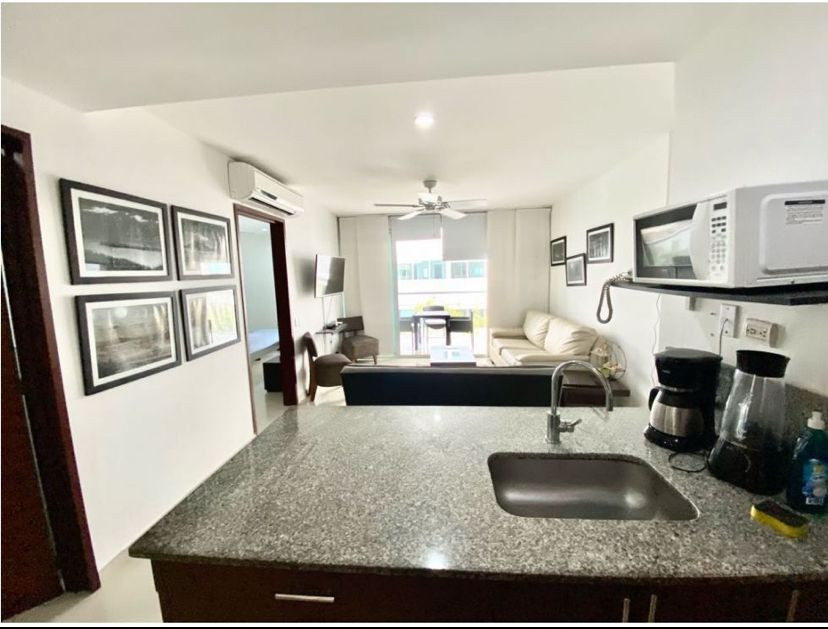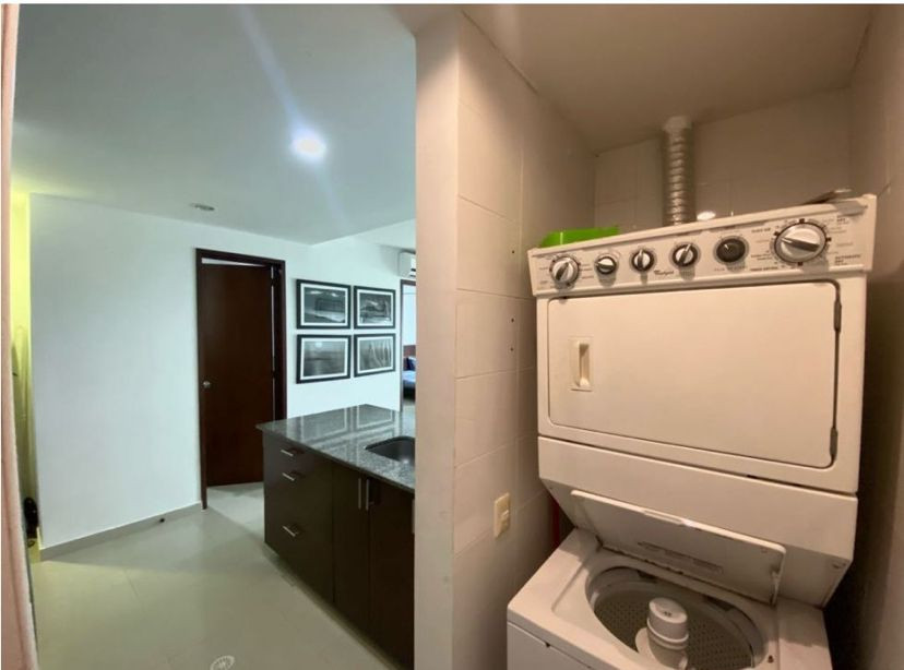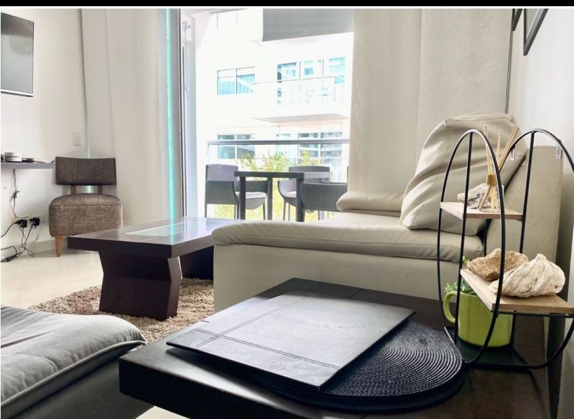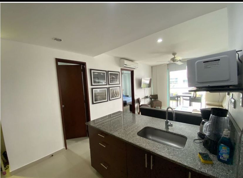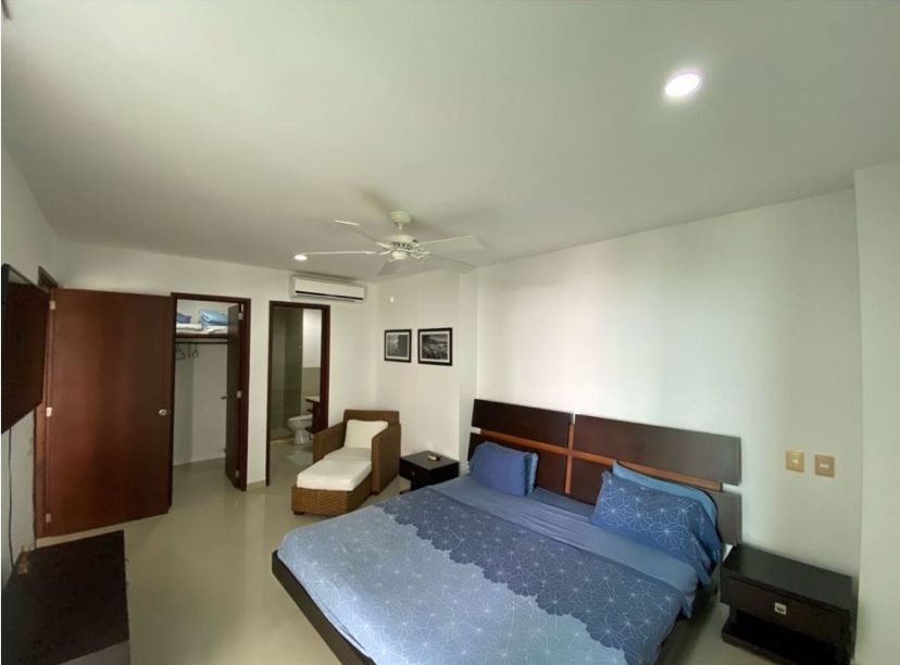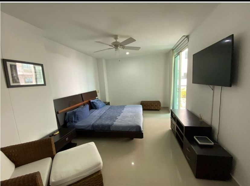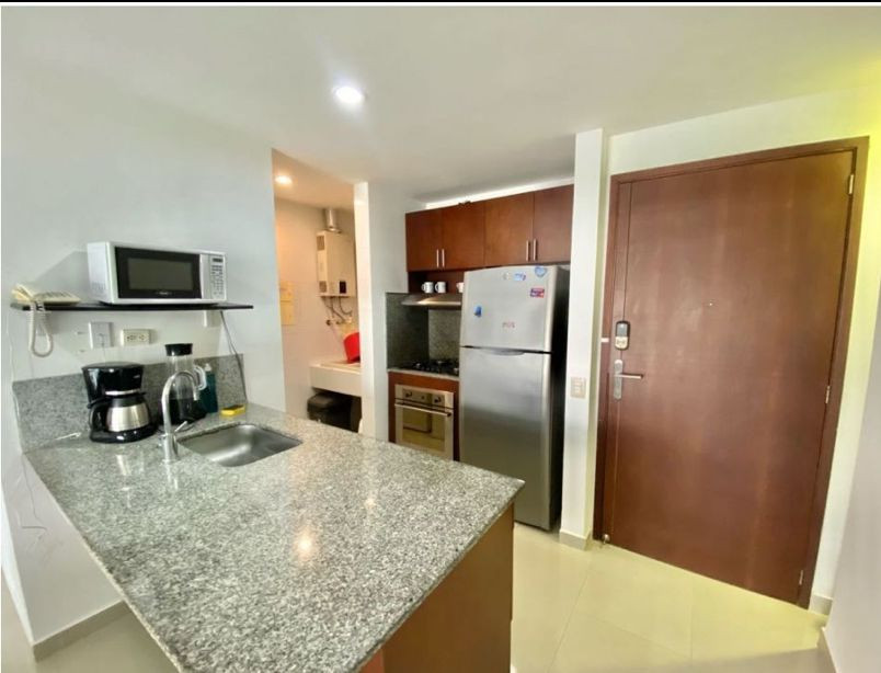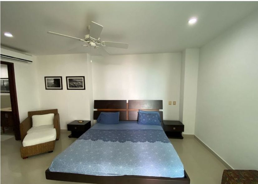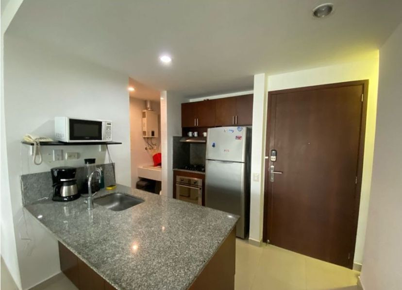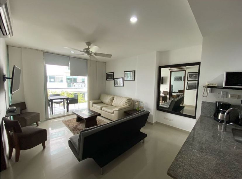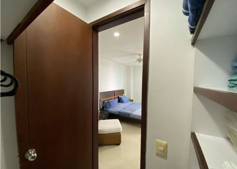 Apartamento amoblado para la venta, ubicado en la zona norte de la ciudad de Cartagena; sector exclusivo y de alta demanda hotelera; ideal para inversionistas, lo puedes promocionar por Airbnb, booking y demás portales de renta turística (actualmente cuenta con reservas existentes); en edificio de 7 pisos con salida directa hacia el mar, consta de multiples piscinas para adultos y niños, salón social para eventos, zona de juegos infantiles, sistema cerrado de TV, vigilancia privada las 24/7, parqueadero cubierto, multiples ascensores, gabinete de incendios, sensor de movimiento, lobby, planta electrica; el apto consta de amplio balcon con vista a la playa, 1 habitacion, 2 baños, closets, sala – comedor, cocina integral abierta, zona de labores, aire acondicionado, mobiliario moderno; a pocos metros del aeropuerto internacional Rafael Nuñez, minimercados, droguerías, restaurantes de comidas típicas y tradicionales, cómodas vías de acceso, a 10 minutos del centro historico