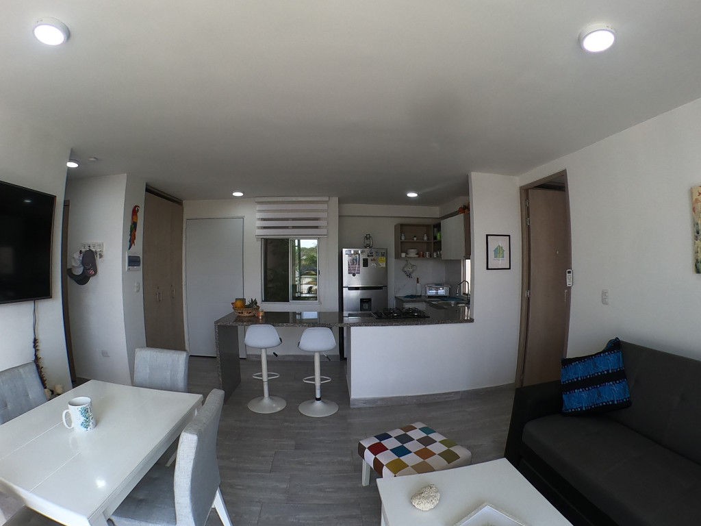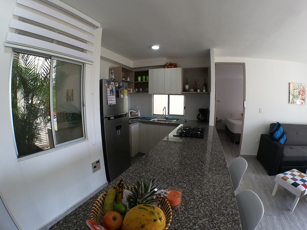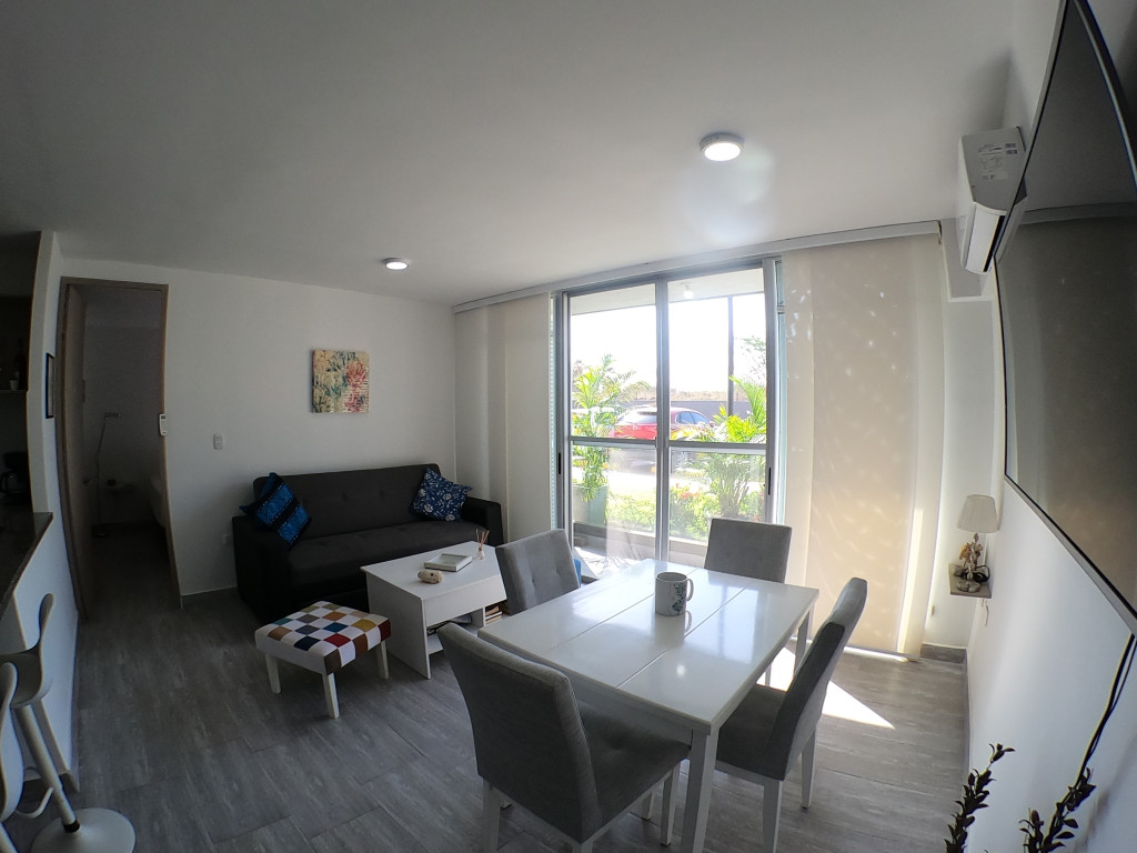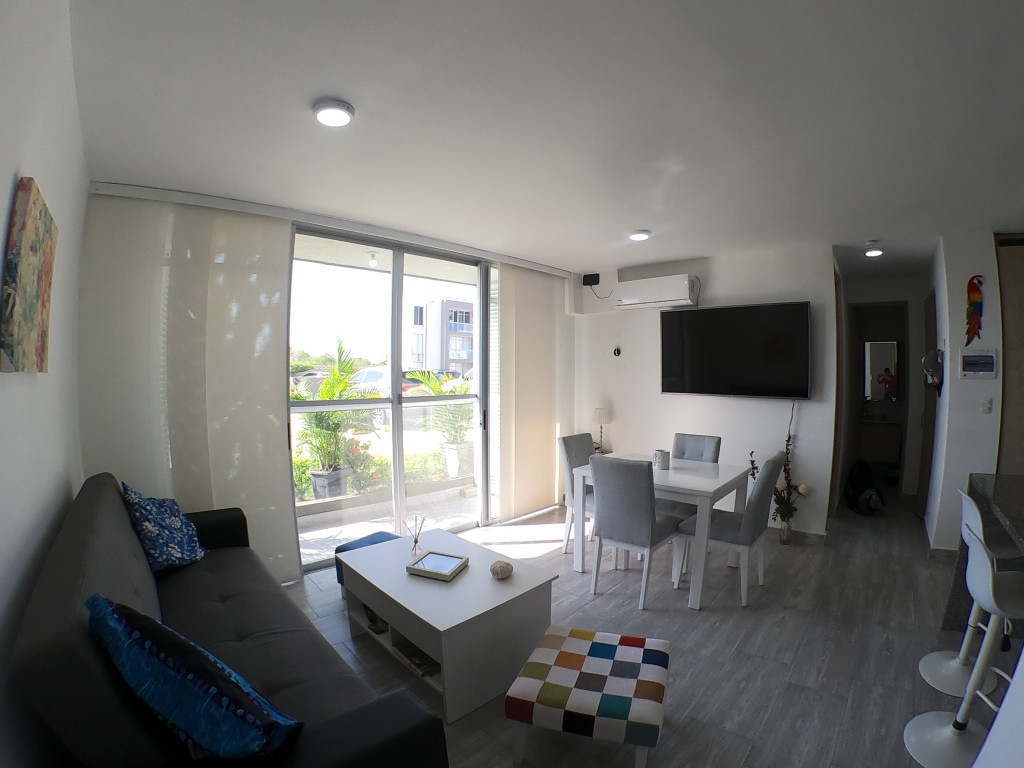 Apartamento en amoblado en venta ubicado en la zona norte de la ciudad de Cartagena, en conjunto residencial con torres de 3 pisos, piscina para adultos y niños, salón social para eventos, zonas verdes, zona de juegos infantiles, vigilancia privada, parqueadero, sistema cerrado TV; El apartamento consta de balcón, sala/comedor con excelente iluminación natural, cocina integral abierta, 2 habitaciones, 2 baños con divisiones en vidrio y excelentes acabados, todo completamente amoblado, Sector exclusivo de la ciudad, cercano a prestigiosa zona comercial, con droguerías, locales de moda, a pocos minutos de playas, aeropuerto y centro histórico de la ciudad.