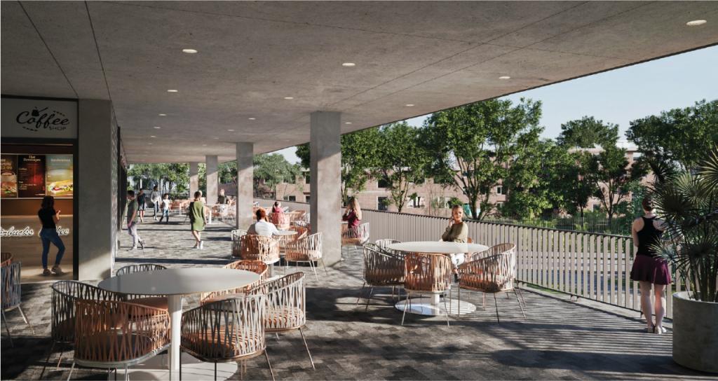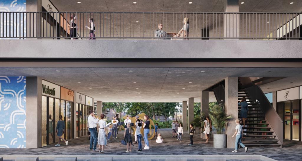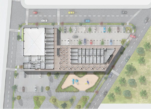 El proyecto se desarrolla en 2 bloques principales, cada uno de dos pisos. El bloque A consta de 22 locales, 9 locales en primer piso y 11 en el segundo, en el que está ubicado un local ancla de Tiendas ARA y 2 espacios para cajeros automáticos. El bloque B consta de 38 locales, 19 en primer piso y 19 en segundo piso. El Centro Comercial tiene además una plazoleta de activación en el 1er piso y una plazoleta de comidas en el 2do piso y cuenta con ascensor