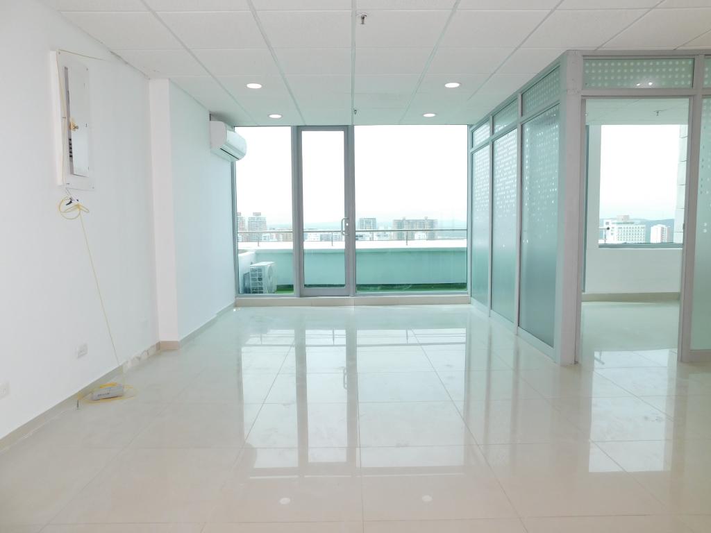 Oficina en arriendo ubicada en complejo comercial, empresarial y hotelero, en el exclusivo sector de La Castellana al norte de la Ciudad de Barranquilla, cuenta con una de las ubicaciones más importantes y estratégicas de la Ciudad, cerca de exclusivos conjuntos residenciales, universidades, colegios, hoteles, complejos clínicos y grandes centros empresariales y comerciales. La oficina, cuenta con 67 m2 de lote y 56.11 m2 de area útil, balcon con hermosa vista, 2 aires acondicionados, 1 oficina interna en vidrio, 1 baño y 2 garajes privados uno al lado del otro. El complejo tiene acabados de lujo, sistema de alta seguridad con circuito cerrado de tv, amplios lobbies, planta eléctrica, ascensores de alta tecnología, baterías de baños en cada piso, Centro de Convenciones, Hotel e Iglesia, centro comercial, aparta office y todo lo necesario para el desarrollo de su actividad comercial y empresarial en un mismo lugar.