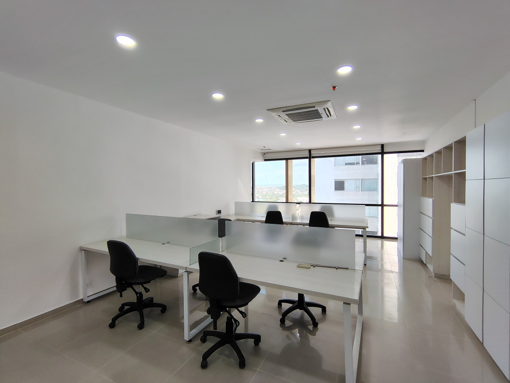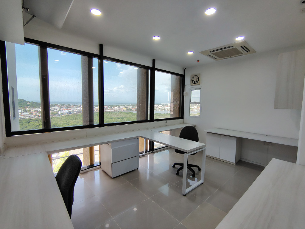 Oficina totalmente amoblada para arriendo, establece tu empresa en un espacio de oficina de prestigio en el barrio Manga, Cartagena. Este moderno edificio empresarial, reconocido por su innovación y calidad con el premio Oro del BID, redefine los espacios de trabajo de alto nivel. Su ubicación estratégica, a pasos de la sociedad portuaria, conecta tu negocio con el centro económico de la ciudad. El edificio ofrece espacios como sala de juntas, el auditorio modular y la terraza panorámica, comedor equipado, parqueaderos cubiertos, baños compartidos, vigilancia privada y un hotel dentro del edificio, 3 ascensores inteligentes, seguridad integral. La oficina cuenta con 68.39 M2 totalmente equipado con mobiliario moderno, cámaras de seguridad, red de datos instalada, blackouts, 2 aires centrales Dispone de 2 PARQUEADEROS PARA VEHICULOS Y 4 PARA MOTOCICLETAS. Este espacio exclusivo proyecta una imagen de profesionalismo y éxito, fortaleciendo la presencia de tu marca en Cartagena.